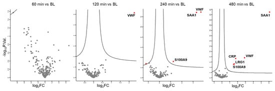 Plasma was collected from 30 individuals at baseline (BL) and 60 min, 120 min, 240 min, and 480 min after LPS challenge (Figure 1, stage 1). Label-free shotgun analysis identified a total of 226 proteins after filtering for high confidence (FDR < 0.01 at protein and peptide level, two peptide identifications per protein) and robustness (independent identification of each protein in at least 21 out of 30 samples (70%) per time point, Supplementary Table S5). Paired t-tests identified no significant event 60 min after LPS challenge, whereas the platelet- and endothelium-derived protein VWF [,] was found to have increased 2 h after the challenge. After another 2 h, the liver-derived biomarker for inflammation, SAA1, and the innate immune cell-derived alarmin, S100A9, were found to be upregulated. Only 8 h after the challenge, the acute-phase protein CRP was found to be upregulated, in addition to LRG1 (Figure 2).