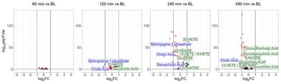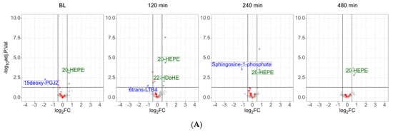 Paired t-tests again identified no significant event 60 min after LPS challenge, whereas 10 different molecules were found to be significantly deregulated (adjusted p-value < 0.01, more than 2-fold regulated) after 120 min. Besides the polyunsaturated fatty acids stearidonic acid, alpha- and gamma-linolenic acid, and trans-isoforms thereof, also a trans-isoform of DHA, was found to be upregulated (Supplementary Tables S6 and S7). The upregulation of the platelet-derived oxylipins TxB2 (significant but less than two-fold), 12-HHTrE, and 12-HETE as described previously [] indicated an early involvement of platelets. The upregulation of taurocholic acid and a downregulation of cholic acid indicated an early involvement of the liver. After another 2 h, the uniform downregulation of various lysophospholipids was striking. The lysophospholipid LPC (0:0/18:2) exhibited a downregulation to approximately 53% of its initial value after 8 h (remaining below a 2-fold change), with an adjusted p-value better than 1E-126. Plasma lysophospholipid levels correspond to the Lands cycle, responsible for the remodeling of phospholipids upon oxidative stress []. The present data thus demonstrated a direct involvement of the Lands cycle in the systemic response to LPS. In addition, one of the best-characterized sphingolipids, sphingosine-1-phosphate, was significantly downregulated as well upon LPS challenge. This sphingolipid is a specific product of erythrocyte and platelet metabolism and an essential regulator of inflammatory signaling [,].