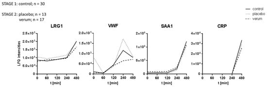 Time course of average LFQ values obtained for LRG1, VWF, SAA1, and CRP. No significant proteome alterations were observed in the verum group treated with antioxidants compared to the placebo group.