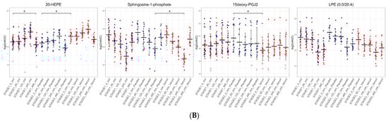 Almost all LPS-induced alterations of oxylipins observed at stage 1 were reproduced at stage 2, with only minor differences between the two groups. Only in the antioxidant group, 2 h after LPS, the anti-inflammatory DHA-derived oxylipin 22-HDoHE was found upregulated, whereas the neutrophil-derived catabolic product of the pro-inflammatory leukotriene LTB4, 6trans-LTB4, was found downregulated (Figure 5A). Sphingosine-1-phosphate, a specific product of erythrocyte, endothelial, and platelet metabolism [], was consistently downregulated in the antioxidant treatment group, with a significant difference 4 h after LPS challenge (Figure 5B).