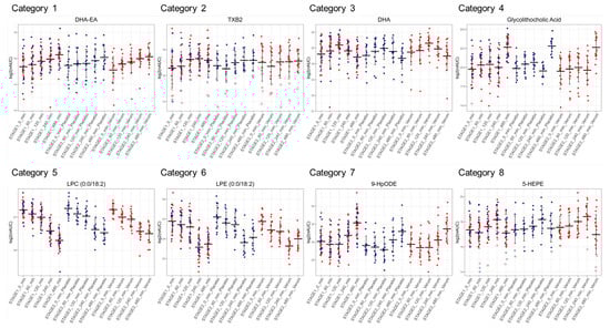The stable time courses observed for most oxylipins showed clock-like features and allowed us to define eight distinct groups displaying specific kinetic features upon LPS challenge: (1) continuously upregulated (n = 3); (2) continuously upregulated, then partially down (n = 18); (3) first upregulated, then down below baseline levels (n = 23); (4) upregulated, down and up again (n = 1); (5) continuously downregulated (n = 10); (6) continuously downregulated then partially up (n = 24); (7) first downregulated, then up above baseline levels (n = 9); and (8) downregulated, up and down again (n = 35). Figure 6 displays representative examples of each category. These groups were found to be populated by molecules sharing a common precursor or a common enzyme responsible for their synthesis (Supplementary Table S9), thus potentially representing functional categories. Category 1 contained the endocannabinoid docosahexaenoyl ethanolamide (DHA-EA) and other ethanolamides. Category 2 contained mainly oxylipins described as being formed by platelets. Mainly polyunsaturated fatty acids were found in category 3. Category 5 contained many lysophosphatidylcholines, whereas category 6 mainly contained lysophosphatidylethanolamines. Some lipoxygenase products from linoleic acid are found in group 7; other lipoxygenase products, several bile acids, and cortisol were found in category 8.