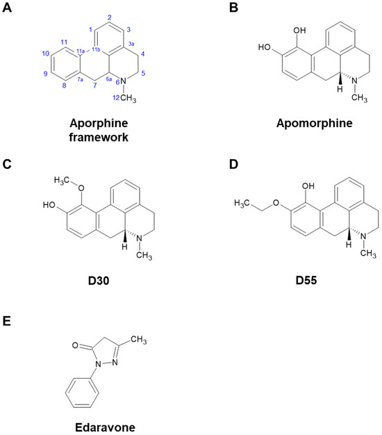 Chemical structures of apomorphine, D30, D55, and edaravone. (A) Aporphine framework. (B) Apomorphine (APO) has two hydroxy groups at positions 10 and 11. (C) D30 possesses a hydroxy group at position 10 and a methoxy group at position 11 in the aporphine alkaloid framework. (D) In D55, an ethoxy group occupies position 10, with a hydroxy group at position 11 in the aporphine alkaloid framework. (E) Edaravone (Eda) is a free radical scavenger, but its structure does not contain an aporphine alkaloid framework.