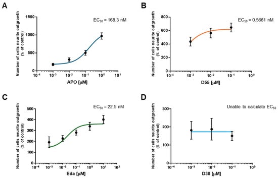 To evaluate the potency of each drug, the half-maximal effective concentration (EC50) was calculated. EC50 values for APO, D55, and Eda were 168.3 nM, 0.5661 nM, and 22.5 nM, respectively (Figure 3A–C). For D30, the EC50 could not be calculated as it does not promote neurite outgrowth (Figure 3D).