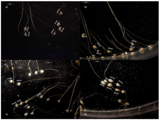 Representative images of byssus mussels taken using the AxioCam MRc 5 stereomicroscope and the AxioVision AC Rel. 4.5 software. The images show the changes in plate length from the control group (a) to the SLS (b), BRG (c) and MIX (d) exposure groups after 14 days of exposure.