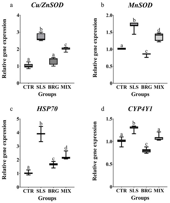 Relative gene expression of (a) Cu/ZnSOD, (b) MnSOD, (c) HSP70, and (d) CYP4Y1 evaluated in gills of mussels exposed for 14 days to 0.01 mg/L of SLS (SLS), 5 mg/L of BRG (BRG) and their combination of 0.01 mg/L SLS + 5 mg/L BRG (MIX). The results are shown as mean ± SD (n = 6) and different letters represent significant differences (p < 0.05) among the different groups.