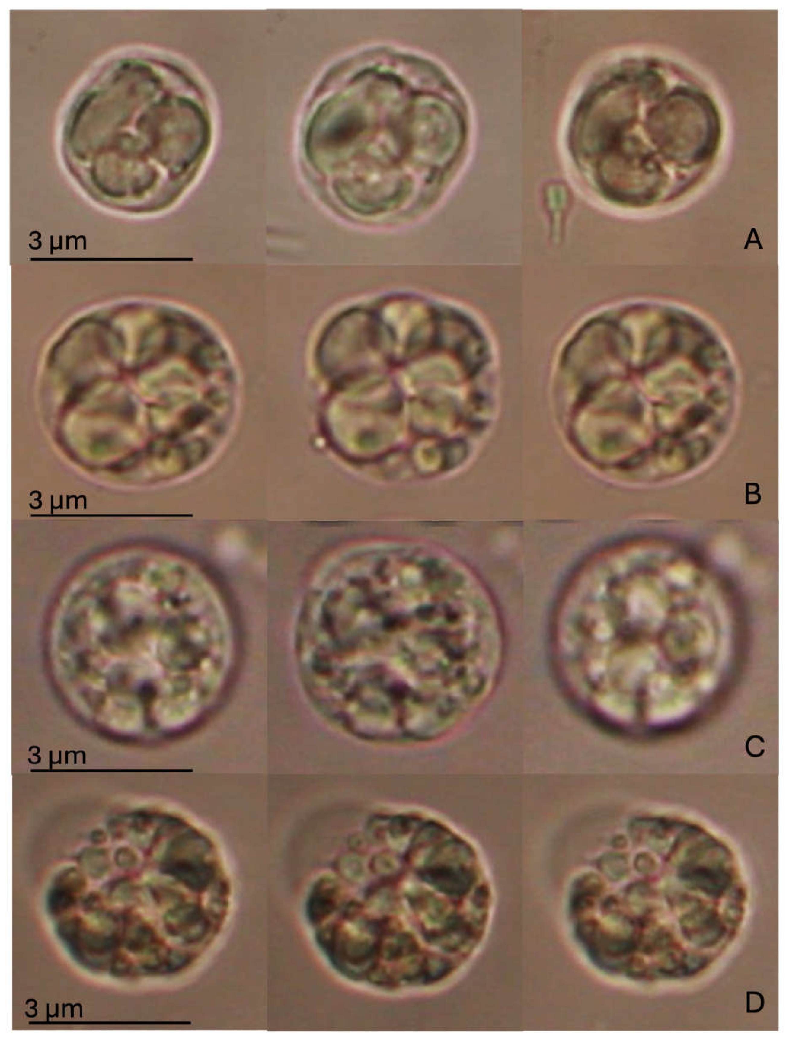 RVD assay in digestive gland cells of Mytilus galloprovincialis exposed to different experimental groups (SLS: 0.01 mg/L, BRG: 5 mg/L, and their combination: 0.01 + 5 mg/L) for 14 days, compared to the Control. The figure displays representative images of a single digestive gland cell observed under an isotonic solution. The three images represent crucial moments of the RVD assay, i.e., control condition (time 0); after 1 min in a hypotonic solution; after 40 min in a hypotonic solution. (A) Control group; (B) SLS; (C) BRG; (D) Mix (SLS + BRG). No significant differences were observed between the control and experimental groups or among the experimental groups.
