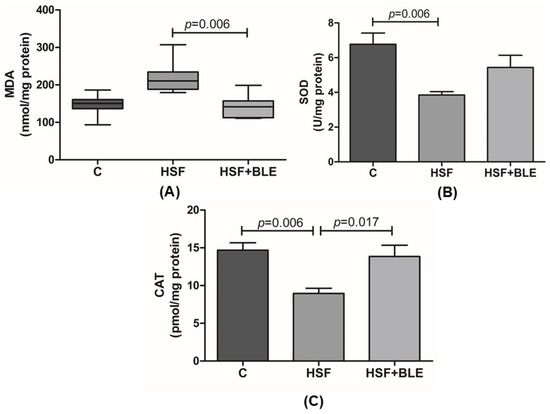 Antioxidant enzyme activities and lipid peroxidation in liver tissue after in vivo exposure. (A) Malondialdehyde (MDA); (B) superoxide dismutase (SOD); (C) catalase (CAT) activities. Control diet (C), high-sugar–fat diet (HSF) and high-sugar–fat diet supplemented with bergamot leaf extract (HSF+BLE) groups. Data are expressed as box plots or means + standard deviations, compared by one-way ANOVA followed by Tukey’s post hoc (CAT and SOD) or by the Kruskal–Wallis test followed by Dunn’s post hoc test (MDA). p ≤ 0.05 is significant.