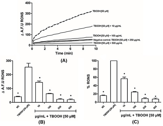Effects of bergamot leaf extract (BLE) on reactive oxygen species (ROS) formation isolated mitochondria from young and healthy Wistar rats. (A) Tracing representatives of the formation and accumulation of ROS; (B) rate of ROS formation of the formation and accumulation of ROS; (C) percentage of accumulated ROS relative to total ROS formation. NC (negative control), A.F.U (arbitrary fluorescence unit). Data are expressed as means + standard deviations, with one-way ANOVA followed by Dunn’s post hoc test used to compare the concentrations and the positive control (TBOOH [50 µM]). (*) indicates significance at p ≤ 0.05, compared to the positive control.