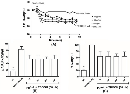Effects of bergamot leaf extract (BLE) on NAD(P)H oxidation of mitochondria. (A) Representative trace of NAD(P)H oxidation; (B) NAD(P)H oxidation; (C) percentage of NAD(P)H oxidation. NC (negative control), A.F.U (arbitrary fluorescence unit). Data are expressed as means + standard deviations, with one-way ANOVA followed by Dunn’s post hoc test used to compare the concentrations and the positive control (TBOOH [50 µM]). (*) indicates significance at p ≤ 0.05, compared to the positive control.