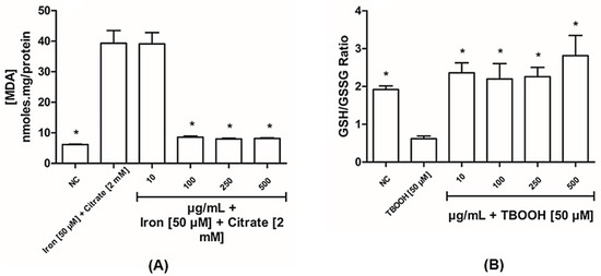 To confirm the ability of BLE to protect liver mitochondria, lipid peroxidation by MDA-TBA complex and GSH/GSSG ratio were evaluated (Figure 5). The extract, in general, was able to protect the mitochondria. However, the lowest concentration (10 µg/mL) of the extract was not able to prevent membrane lipid peroxidation by the ferro-citrate system.