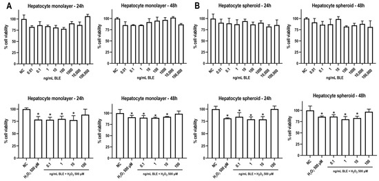 Effects of bergamot leaf extract (BLE) on hydrogen peroxide (H2O2)-induced cytotoxicity in (A) 2D and (B) 3D hepatocyte models. Monolayers were exposed to H2O2 (500 µm) to induce cytotoxicity and were simultaneously treated with BLE at 0.1, 1, 10, and 100 ng/mL for 24 or 48 h. NC (negative control). Data are expressed as means + standard deviations, compared using one-way ANOVA followed by Tukey’s post hoc test. (*) indicates significance compared to NC and/or 100 ng/mL at p ≤ 0.05.