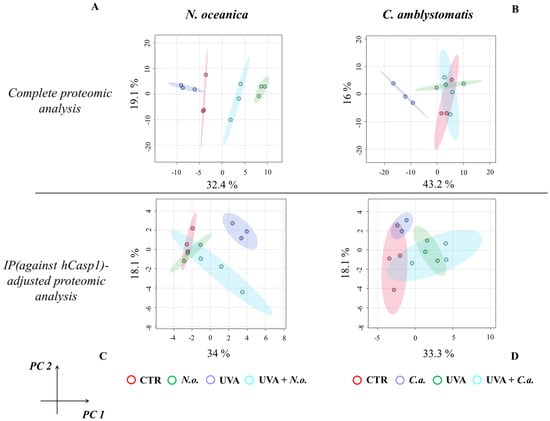 Principal component analysis of the fibroblast proteome from experimental cell groups treated with N. oceanica or C. amblystomatis lipid extracts. The analysis was conducted for the complete proteomic dataset (A,B) and the IP (hCasp1)-adjusted proteomic dataset (C,D) [CTR, control cells cultured in the 3D system with standard medium; N.o., the cells treated with lipid extract obtained from N. oceanica (3 µg/mL) for 24 h; C.a., the cells treated with lipid extract obtained from C. amblystomatis (3 µg/mL) for 24 h; UVA, the cells exposed to UVA (365 nm) at a dose of 13 J/cm3 and incubated in the 3D system with the standard growing medium for 24 h; UVA + N.o., the cells exposed to UVA (365 nm) at a dose of 13 J/cm3 and then incubated in the 3D system with the standard growing medium containing lipid extracts from N. oceanica (3 µg/mL) for 24 h; UVA + C.a., the cells exposed to UVA (365 nm) at a dose of 13 J/cm3 and then incubated in the 3D system with the standard growing medium containing lipid extracts from C. amblystomatis (3 µg/mL) for 24 h; IP (against hCasp1), immunoprecipitation against human caspase−1; PC1/2, principal component 1/2].