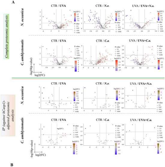 Volcano plots showing the effects of N. oceanica and C. amblystomatis lipid extracts on the proteome of fibroblasts in 3D-cultured experimental cell groups. The plots compare differential protein expression within the complete proteomic analysis (A) and the IP (hCasp1)-adjusted proteomic analysis (B) (CTR, control cells cultured in the 3D system with standard medium; N.o., the cells treated with lipid extract obtained from N. oceanica (3 µg/mL) for 24 h; C.a., the cells treated with lipid extract obtained from C. amblystomatis (3 µg/mL) for 24 h; UVA, the cells exposed to UVA (365 nm) at a dose of 13 J/cm3 and incubated in the 3D system with the standard growing medium for 24 h; UVA + N.o., the cells exposed to UVA (365 nm) at a dose of 13 J/cm3 and then incubated in the 3D system with the standard growing medium containing lipid extracts from N. oceanica (3 µg/mL) for 24 h; UVA + C.a., the cells exposed to UVA (365 nm) at a dose of 13 J/cm3 and then incubated in the 3D system with the standard growing medium containing lipid extracts from C. amblystomatis (3 µg/mL) for 24 h; IP (against hCasp1), immunoprecipitation against human caspase-1; significant features highlighted as blue and red as seen in figure-fold change had p < 0.05).