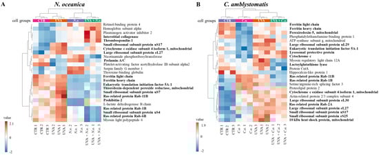Heatmap of the top 25 proteins with significantly altered expression in fibroblasts derived from experimental cell groups treated with N. oceanica or C. amblystomatis lipid extracts (A,B) within the complete proteomic analysis. The hierarchical clustering demonstrates distinct proteomic profiles across treatment conditions (CTR, control cells cultured in the 3D system with standard medium; N.o., the cells treated with lipid extract obtained from N. oceanica (3 µg/mL) for 24 h; C.a., the cells treated with lipid extract obtained from C. amblystomatis (3 µg/mL) for 24 h; UVA, the cells exposed to UVA (365 nm) at a dose of 13 J/cm3 and incubated in the 3D system with the standard growing medium for 24 h; UVA + N.o., the cells exposed to UVA (365 nm) at a dose of 13 J/cm3 and then incubated in the 3D system with the standard growing medium containing lipid extracts from N. oceanica (3 µg/mL) for 24 h; UVA + C.a., the cells exposed to UVA (365 nm) at a dose of 13 J/cm3 and then incubated in the 3D system with the standard growing medium containing lipid extracts from C. amblystomatis (3 µg/mL) for 24 h). Proteins written in bold type characters present the proteins that are critical in regulating the dynamic oxidative stress and related inflammatory response as well as cell survival. Turning to the case of C. amblystomatis lipid extract within the complete proteomic analysis, the expression of lactoylglutathione lyase (Q04760) was found to be nearly 4-fold increased by UVA exposure but was significantly reduced following treatment with the C. amblystomatis lipid extract. Similarly, the UVA-induced upregulation of ubiquitin-conjugating enzyme E2 variant 1 (Q13404) was also significantly reduced by C. amblystomatis lipid extract treatment (approximately 0.7-fold change). On the other hand, the expression of prostaglandin E synthase 3 (Q15185) was moderately increased by UVA exposure (1.16-fold) and was further elevated slightly by C. amblystomatis lipid extract treatment (1.01-fold change). Additionally, the increase in eukaryotic translation initiation factor 5A-1 (P63241) expression caused by UVA exposure was significantly decreased following C. amblystomatis lipid extract treatment (0.7-fold change). Although this trend was also observed with N. oceanica lipid extract, the effect of N. oceanica was milder compared to C. amblystomatis. Furthermore, UVA exposure caused a dramatic decrease in cathepsin B (P07858) levels (0.8-fold), but C. amblystomatis lipid extract treatment mitigated this decline (0.05-fold change).