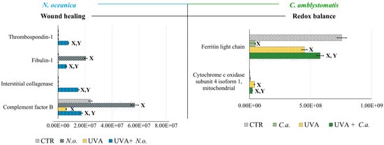 Changes in the average intensity levels of proteins involved in the regulation of wound healing (N. oceanica) or redox balance (C. amblystomatis) with significantly altered expression in fibroblasts derived from experimental cell groups (CTR, control cells cultured in the 3D system with standard medium; N.o., the cells treated with lipid extract obtained from N. oceanica (3 µg/mL) for 24 h; C.a., the cells treated with lipid extract obtained from C. amblystomatis (3 µg/mL) for 24 h; UVA, the cells exposed to UVA (365 nm) at a dose of 13 J/cm3 and incubated in the 3D system with the standard growing medium for 24 h; UVA + N.o., the cells exposed to UVA (365 nm) at a dose of 13 J/cm3 and then incubated in the 3D system with the standard growing medium containing lipid extracts from N. oceanica (3 µg/mL) for 24 h; UVA + C.a., the cells exposed to UVA (365 nm) at a dose of 13 J/cm3 and then incubated in the 3D system with the standard growing medium containing lipid extracts from C. amblystomatis (3 µg/mL) for 24 h). Mean values ± SD of three independent samples and statistically significant differences for p ≤ 0.05 are presented: (X) is used for differences vs. CTR; (Y) is used for differences between the group UVA and UVA + N.o. or UVA + C.a.