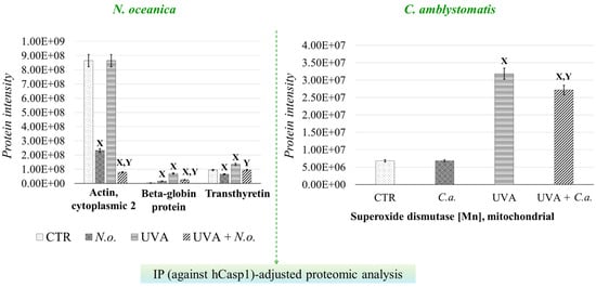 Changes in the average intensity levels of proteins with significantly altered expression in fibroblasts derived from experimental cell groups (CTR, control cells cultured in the 3D system with standard medium; N.o., the cells treated with lipid extract obtained from N. oceanica (3 µg/mL) for 24 h; C.a., the cells treated with lipid extract obtained from C. amblystomatis (3 µg/mL) for 24 h; UVA, the cells exposed to UVA (365 nm) at a dose of 13 J/cm3 and incubated in the 3D system with the standard growing medium for 24 h; UVA + N.o., the cells exposed to UVA (365 nm) at a dose of 13 J/cm3 and then incubated in the 3D system with the standard growing medium containing lipid extracts from N. oceanica (3 µg/mL) for 24 h; UVA + C.a., the cells exposed to UVA (365 nm) at a dose of 13 J/cm3 and then incubated in the 3D system with the standard growing medium containing lipid extracts from C. amblystomatis (3 µg/mL) for 24 h) within IP(against hCasp1)-adjusted proteomic analysis. Mean values ± SD of three independent samples and statistically significant differences for p ≤ 0.05 are presented: (X) is used for differences vs. CTR; (Y) is used for differences between the group UVA and UVA + N.o. or UVA + C.a. [IP (against hCasp1), immunoprecipitation against human caspase-1].