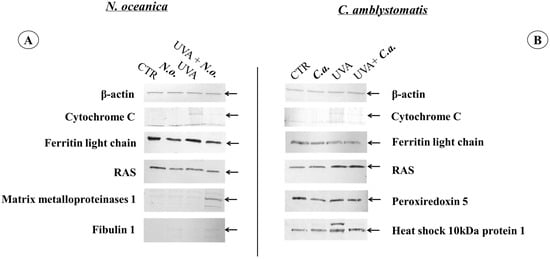 Western blot analysis against β-actin, cytochrome C, ferritin light chain, RAS, peroxiredoxin 5, heat shock 10 kDa protein 1, matrix metalloproteinases 1 or fibulin 1 in the case of N. oceanica (A) or C. amblystomatis (B) lipid extract treatment of fibroblasts [CTR group, control fibroblasts cultured in 3D system with standard medium; N.o. group, the fibroblasts treated with lipid extract obtained from N. oceanica (3 µg/mL) for 24 h; C.a. group, the fibroblasts treated with lipid extract obtained from C. amblystomatis (3 µg/mL) for 24 h; UVA group, the fibroblasts exposed to UVA (365 nm) at a dose of 13 J/cm3 and incubated in 3D system with the standard growing medium for 24 h; UVA + N.o. group, the fibroblasts exposed to UVA (365 nm) at a dose of 13 J/cm3 and then incubated in 3D system with the standard growing medium containing lipid extracts from N. oceanica (3 µg/mL) for 24 h; UVA + C.a. group, the fibroblasts exposed to UVA (365 nm) at a dose of 13 J/cm3 and then incubated in 3D system with the standard growing medium containing lipid extracts from C. amblystomatis (3 µg/mL) for 24 h]. The relevant protein band has been shown with a black arrow. All the original photos of the membranes are presented in Supplementary Figure S2.