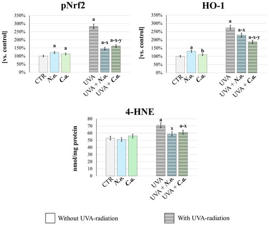 Assessment of cellular antioxidant response and oxidative stress. The level of phosphorylated-Nrf2 (pNrf2, active), heme oxygenase-1 (HO-1) and 4-HNE (lipid peroxidation product, oxidative stress marker) were determinated in fibroblasts [CTR group, control fibroblasts cultured in 3D system with standard medium; N.o. group, the fibroblasts treated with lipid extract obtained from N. oceanica (3 µg/mL) for 24 h; C.a. group, the fibroblasts treated with lipid extract obtained from C. amblystomatis (3 µg/mL) for 24 h; UVA group, the fibroblasts exposed to UVA (365 nm) at a dose of 13 J/cm3 and incubated in 3D system with the standard growing medium for 24 h; UVA + N.o. group, the fibroblasts exposed to UVA (365 nm) at a dose of 13 J/cm3 and then incubated in 3D system with the standard growing medium containing lipid extracts from N. oceanica (3 µg/mL) for 24 h; UVA + C.a. group, the fibroblasts exposed to UVA (365 nm) at a dose of 13 J/cm3 and then incubated in 3D system with the standard growing medium containing lipid extracts from C. amblystomatis (3 µg/mL) for 24 h]. The levels of pNrf2 and HO-1 (ng/mg protein) were expressed as a percentage of the expression observed in the control cells (as explained in Section 2.6.2) and obtained 4-HNE values were expressed as nmol/mg protein (as explained in Section 2.7). Mean values ± SD of three independent samples and statistically significant differences for p ≤ 0.05 are presented: (a) is used for differences vs. CTR; (b) is used for differences between N.o. group and C.a. group; (x) is used for differences between UVA group and UVA + N.o. group/UVA + C.a. group; (y) is used for differences between UVA + N.o. group and UVA + C.a. group.