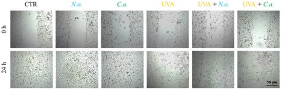 The obtained results show that UVA radiation significantly reduces the fibroblast proliferation and migration, leading to a decrease in the regenerative capacity of skin. Both of the microalgae extracts used slightly counteracted this effect caused by UVA (Figure 9). In the case of fibroblasts not exposed to UVA radiation, no changes in the growth rate induced by lipid extracts were observed; within 24 h of incubation, the fibroblasts from all un-UVA-exposed groups were able to cover the entire surface of the furrow.