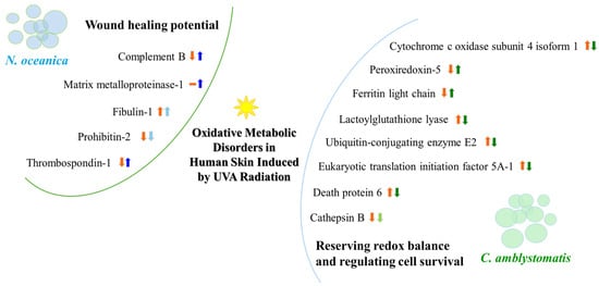 A summary illustration of the wound healing potential of N. oceanica lipid extract and the redox balance and cell survival regulatory actions of C. amblystomatis lipid extract. The figure highlights alterations in protein expression and their impact on associated intracellular molecular signaling pathways. [An upward arrow signifies an increase, while a downward arrow indicates a decrease in protein expression, within orange color (showing UVA effect) or blue/green color (showing the effect of treatment with N. oceanica or C. amblystomatis lipid extracts following UVA radiation). Light blue/green colors are used to express the slowing down effect. The dash symbol is used to represent no protein identification.].