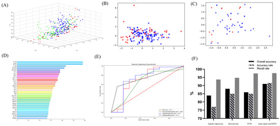 A food-derived electrophilic compounds database comprising 332 compounds was utilized to classify the biological properties of electrophilic compounds found in food sources. By analyzing their three-dimensional structures, a total of 1664 molecular descriptors were identified. To reduce the dimensionality of this dataset and transform high-throughput data into intuitively readable 2D or 3D models, a principal component analysis (PCA) was applied. As shown in Figure 1A–C, the blue balls representing positive effects and the red balls representing negative effects are stacked on top of each other with no obvious boundaries. Besides, The green balls represent foodborne electrophilic compounds of unknown potency. This situation calls for the use of more machine learning models, which utilize training datasets, to predict the biological activities of these compounds.