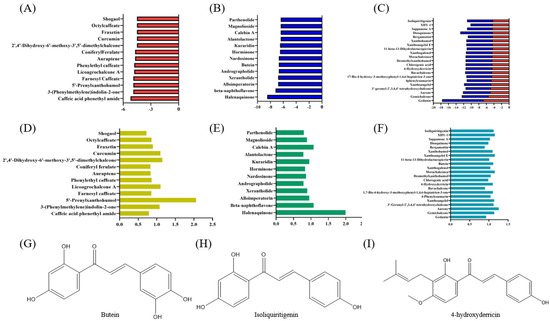 Virtual screening of cytoprotective electrophilic compounds. (A–C) Molecular docking scores. (D–F) Fukui function. (G–I) Structure of butein, isoliquiritigenin, and 4-hydroxyderricin.