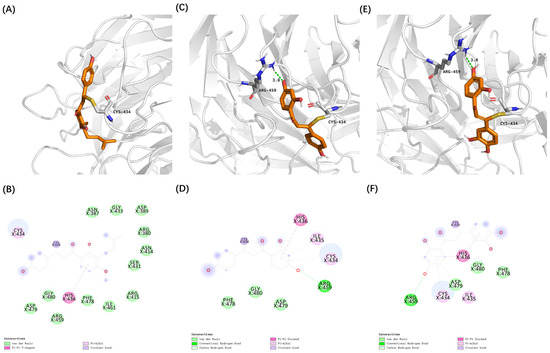 Covalent docking poses of cytoprotective electrophilic compounds and Cys434 of Keap1. (A,B) 4HD. (C,D) ISO. (E,F) butein.
