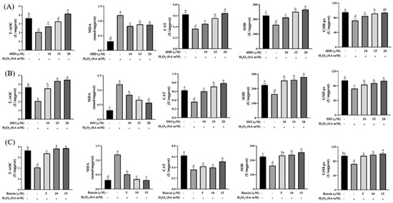 As shown in Figure 7, treatment with 4HD, ISO, and butein significantly enhanced the activities of SOD, CAT, and GSH-Px, which were otherwise reduced by H2O2 exposure. Additionally, these compounds increased T-AOC levels, decreased MDA content, and exhibited a dose-dependent effect (p < 0.05).