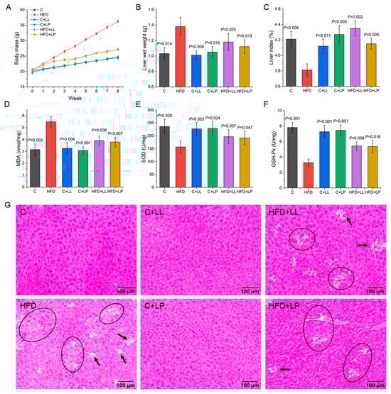 The high-fat diet (HFD)-induced obesity model demonstrated significant hepatic alterations beyond increased body weight, including elevated liver wet weight and reduced liver index. Compared to the control animals, the HFD-fed mice exhibited a 33.98% increase in liver wet weight (p < 0.05, Figure 1B) and a 0.4% decrease in the liver index (p < 0.05, Figure 1C), confirming successful obesity induction and substantial hepatic impact. LAB intervention effectively mitigated these changes, with the HFD+LL and HFD+LP groups showing 14.49% and 18.84% reductions in liver wet weight, respectively (p < 0.05, Figure 1B), demonstrating LAB’s therapeutic potential in ameliorating obesity-related hepatic alterations. After LAB intervention, the liver index of the mice was significantly increased (p < 0.05) and recovered to the control level (Figure 1C), indicating that the liver index of obese mice could be significantly increased by the gavage of LAB. In addition, there were no significant differences in liver wet weight and liver index between the C+LL, C+LP group, and control group, indicating that LAB had no significant effects on the liver wet weight and liver index of normal mice. Li et al. utilized soybean milk fermented by Lactiplantibacillus plantarum HFY01 to reduce weight and fat in HFD-induced obese mice []. The results indicated that the fermented soybean milk could lower the body fat percentage and liver index of the obese mice, and effectively inhibit obesity induced by a high-fat diet, demonstrating significant potential for application.