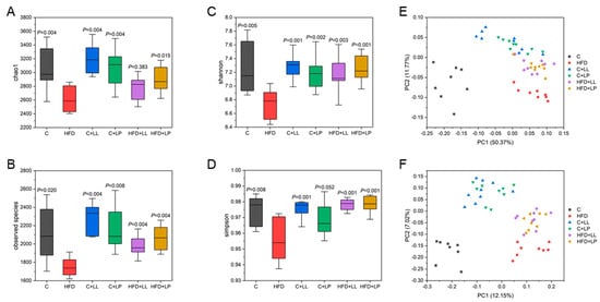 Effects of LAB on the alpha-diversity index and beta-diversity index of the gut microbiota in mice: (A) chao1 index; (B) observed species; (C) shannon index; (D) simpson index; (E) PCoA plot based on weighted UniFrac distance; (F) PCoA plot based on unweighted UniFrac distance. Compared with the HFD group, the difference was statistically significant at p < 0.05.
