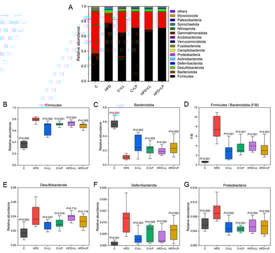 Effects of LAB on the distribution and relative abundance of the gut microbiota in mice at the phylum level. (A) Overall distribution of the first 15 phyla; (B) Firmicutes; (C) Bacteroidetes; (D) Firmicutes/Bacteroidetes ratio; (E) Desulfobacterota; (F) Deferribacteres; (G) Proteobacteria. Compared with the HFD group, the difference was statistically significant at p < 0.05.