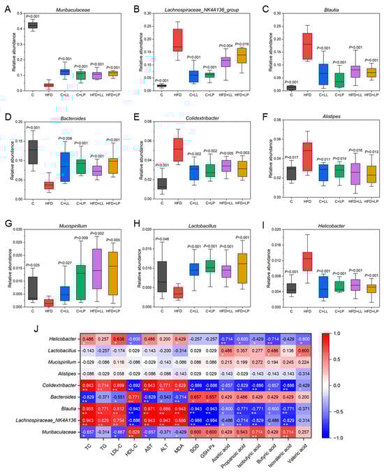 Effects of LAB on the relative abundances of main species in the gut microbiota of the mice at the genus level (A–I), and Spearman’s correlation coefficients between serum lipids, liver oxidative stress levels, gut short-chain fatty acids (SCFAs), and representative genus of the gut microbiota in the mice (J). Compared with the HFD group, the difference was statistically significant at p < 0.05 (A–I). * p < 0.05; ** p < 0.01 (J).