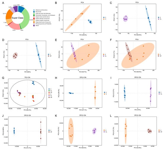 Multivariate statistical analysis results of the gut metabolites in the mice: (A) Classification pie chart of gut metabolites in mice. (B–F) PCA diagram of the gut metabolites in the mice. (G) PLS-DA plot of the gut metabolites in the mice. (H–L) PLS-DA plot of the gut metabolites in the mice.