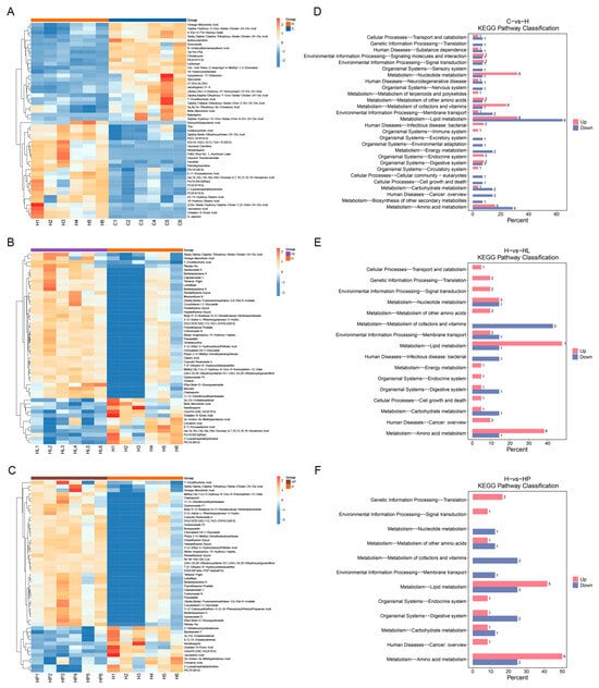 Pathway enrichment analysis of differential metabolites provides valuable insights into the underlying mechanisms of metabolic pathway alterations in comparative samples. Figure 6D–F illustrates the KEGG level 2 classification of both the up-regulated and down-regulated metabolites across the different experimental groups in the murine gut. The results showed that compared with the group C and H, the gut pathways related to lipid metabolism, nucleotide metabolism, and amino acid metabolism were more enriched, and the relative contents of up-regulated and down-regulated metabolites were significantly different. The relative contents of up-regulated and down-regulated metabolites related to lipid metabolism were 32.00% and 64.29%, respectively. The relative contents of up-regulated and down-regulated metabolites related to nucleotide metabolism were 32.00% and 7.14%, respectively. The relative contents of up-regulated and down-regulated metabolites related to amino acid metabolism were 16.00% and 28.57%, respectively. It was shown that a high-fat diet led to an increase in the metabolites associated with lipid metabolism in the gut of the mice, which was associated with an increase in the content of lipid-associated long-chain fatty acids in the gut differential metabolite analysis results.