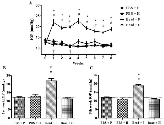 (A–C) Changes in IOP in Sprague Dawley rats during the eight experimental weeks. Comparison of IOP values in week 1 (B) and week 8 (C). Intracamerally applied microbeads significantly increased IOP. (*) p < 0.05 vs. PBS + P; (#) p < 0.05 vs. Bead + H. The time of microbead administration is indicated by an arrow (↑) in the (A) graph. Baseline is indicated as dotted lines in (B,C) graphs. Values are expressed in mean ± standard error of the mean (SEM). Abbreviations: PBS + P—control group; PBS + H—herbal treatment control; Bead + P—placebo-treated glaucoma group; Bead + H—herbal-treated glaucoma group; IOP—intraocular pressure.
