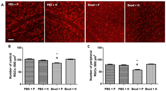 The percentage loss of central and peripheral retinal ganglion cells (RGCs) compared to the control group (PBS + P). Abbreviations: PBS + P—control group; PBS + H—herbal treatment control; Bead + P—placebo-treated glaucoma group; Bead + H—herbal treatment glaucoma group.