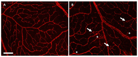 Retina whole mount with an endothelial cell-specific marker (Isolectin-B4). Images of retina preparations were taken at 40× microscopic magnification (scale bar—500 µm). In the control group (PBS + P) (A), the condition of the retinal vessels appears macroscopically intact, reflecting a normal state. In the glaucoma placebo-treated group (Bead + P) (B), microaneurysms (indicated by asterisks) and new anastomoses caused by neovascularization (indicated by arrows) are observed, indicating retinal ischemia and damage. Faintly visible are the anastomoses in the deeper layers of the glaucomatous retina (B), which are absent in the healthy specimen (A).