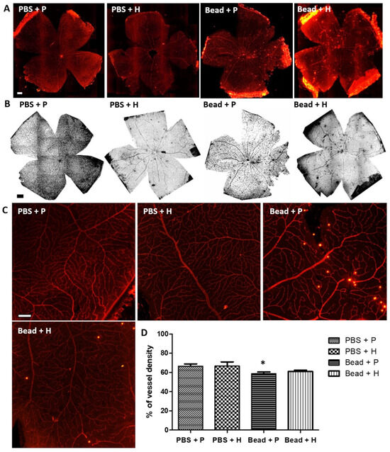 Retina whole mount with endothelial cell-specific marker (Isolectin-B4). Images of retina preparations were taken at 4× microscopic magnification (Series (A), scale bar–500 µm). The vascular condition of the retina was made contrast visible using the ImageJ (version 1.54g, NIH, USA) vessel density program plugin (Series (B), scale bar—500 µm). Magnified images (Series (C), magnification— 20×; scale bar—100 µm) were taken from a 500 µm2 peripheral area. In the percentage of vascularization of the retina samples, the placebo-treated glaucoma group (Bead + P: 58.73 ± 1.69%) was significantly (* p < 0.05) lower compared to the control group (PBS + P: 66.55 ± 2.36%) (D). The difference between PBS + P, PBS + H (66.74 ± 4.2%), and Bead + H (60.94 ± 1.47%) was not statistically significant. Values are expressed in mean ± standard error of the mean (SEM). Abbreviations: PBS + P—control group; PBS + H—herbal treatment control; Bead + P—placebo-treated glaucoma group; Bead + H—herbal treatment glaucoma group.