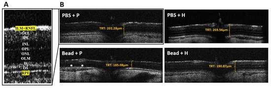SD-OCT B-scan detailed retinal layers (A) and images (B) of Sprague Dawley rat retinas. The significantly thinner retinal structure of the glaucomatous rat group treated with placebo (Bead + P) can also be confirmed when compared with the OCT images, highlighting the total retinal thickness (TRT). The regions marked with an asterisk (*) on the diagram indicate areas where the retinal cross-section has significantly thinned. Abbreviations: PBS + P— control group; PBS + H—herbal treatment control; Bead + P—placebo-treated glaucoma group; Bead + H—herbal treatment glaucoma group; ILM—inner limiting membrane; RNFL—retinal nerve fiber layer; GCL—ganglion cell layer; IPL—inner plexiform layer; INL—inner nuclear layer; OPL—outer plexiform layer; ONL—outer nuclear layer; OLM—outer limiting membrane; IS—(photoreceptor’s) inner segment; OS—(photoreceptor’s) outer segment; RPE—retinal pigment epithelium; TRT—total retinal thickness.