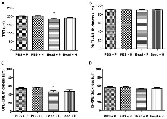 Comparison of total retinal thickness (TRT) (A) and different retinal layer thicknesses in the 8th experimental week (B) from the retinal nerve fiber layer (RNFL) to the inner nuclear layer (INL); (C) from the outer plexiform layer (OPL) to the outer nuclear layer (ONL); (D) from the inner segment of the photoreceptors (IS) to the retinal pigment epithelium (RPE) measured during OCT examination of Sprague Dawley rats with those of the combined herbal eye drop-treated groups; (*) p < 0.05 vs. PBS + P. Values are expressed in mean ± standard error of the mean (SEM). Abbreviations: PBS + P—control group; PBS + H—herbal treatment control; Bead + P—placebo-treated glaucoma group; Bead + H—herbal treatment glaucoma group.