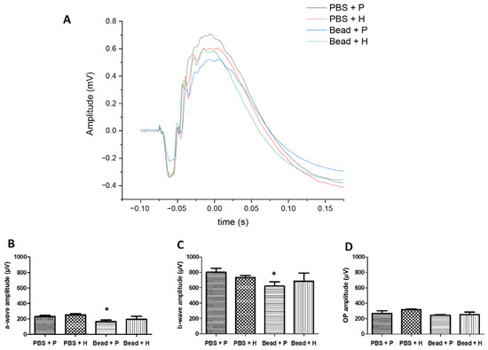 During ERG testing in Sprague Dawley rats, the average amplitudes of the a-waves, b-waves, and oscillatory potentials were recorded in the eighth experimental week (B–D). (*) p < 0.05 vs. PBS + P. The average waveforms (A) are consistent with the (B,C) graphs, with significant differences observed in the amplitude of the a- and b-waves (A–C). Values are expressed as mean ± standard error of the mean (SEM). Abbreviations: OP—oscillatory potential; PBS + P—control group; PBS + H—combined active treatment control group—Bead + P—placebo-treated glaucomatous group; Bead + H—combined active treatment glaucomatous group.