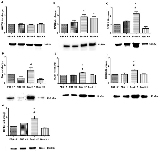 Western blot analysis of Sprague Dawley rat retina samples (A–G). GAPDH protein (A) was chosen for quantitative standardization of sample amounts and normalization of results. (*) p < 0.05 vs. PBS + P; (#) p < 0.05 vs. Bead + H. Values are expressed in mean ± standard error of mean (SEM). Abbreviations: PBS + P—control group; PBS + H—herbal treatment control; Bead + P—placebo-treated glaucoma group; Bead + H—herbal treatment glaucoma group; GAPDH—glyceraldehyde-3-phosphate dehydrogenase (A); NFκB—nuclear factor κ-B (B); GFAP—glial fibrillary acidic protein (C); Bax—Bcl-2 Associated X-protein (D); BDNF—brain-derived neurotrophic factor (E); CREB—cAMP response element-binding protein (F); HIF1α—hypoxia-inducible factor 1-alpha (G).