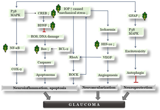 NFκB plays a crucial role in supporting neuronal survival against inflammatory processes and is activated by stimuli such as hyperglycemia or hypoxia. In aging retinas, its expression increases, leading to the activation of Müller cells and microglia under stress. In glaucoma, elevated NFκB expression is observed in the GCL and INL [70,71]. Amato et al. also detected NFκB expression during their examination of oral M. spicata supplementation [63]. Elevated IOP further induces cellular stress in retinal astrocytes and glial cells, detectable by GFAP. Elevated GFAP is a marker of metabolic stress in retinal tissue, indicating a compensatory response for the survival of Müller cells and astrocyte glial cells [44,72,73]. Szabo et al. also demonstrated neuroprotective effects using GFAP and Brn3a in their rat model treated with PACAP 1-38 polypeptide [44]. The caspase cascade and Bcl-2/Bax pathways are crucial in intrinsic apoptotic processes, with Bax promoting mitochondrial membrane permeability and cytochrome C release, leading to apoptosis [74]. Pre-pro-BDNF and then cleaved-pro-BDNF precursor, stored in dendrites or axons, is released in both pro- and mature BDNF forms, binding to TrkB (tropomyosin receptor kinase B) receptors to promote cell survival and neuroplasticity [3,75]. Amato et al. demonstrated the anti-apoptotic and neuroprotective effects of M. spicata extract in a glaucoma rat model through BDNF detection [63]. CREB activity in neurons is linked to processes like proliferation, differentiation, survival, synaptic potentiation, neurogenesis, and plasticity. Activated CREB promotes BDNF expressions, and vice versa, through TrkB receptors. CREB inhibition triggers apoptosis, while chronic activation leads to neuron loss via excitotoxicity [76]. These findings suggest different types of MAPK-CREB pathway activation were observed in glial cells and RGCs [77]. CREB also mediates hypoxia-induced gene expression, including VEGF-A, contributing to pathological retinal neovascularization [78]. HIF1α mediates the retinal hypoxia pathway, initiating neovascularization through VEGF. Immunohistochemical analysis confirmed elevated HIF1α levels in post-mortem glaucomatous retinal tissue, indicating hypoxic conditions in vessel endothelial cells, RPE, RGCs, Müller cells, pericytes, and other neurons [3,59].