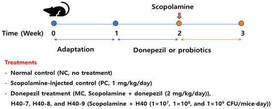 - Lee, N.K.; Lee, Y.; Hwang, J.; Park, E.; Paik, H.D. Heat-killed Leuconostoc mesenteroides H40 alleviates cognitive impairment by anti-inflammation and antioxidant effects in a scopolamine-induced mouse model. J. Microbiol. Biotechnol. 2025, 35, e2411013. [Google Scholar] [CrossRef] [PubMed]
