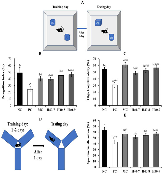 3.1. Effect of Probiotic H40 on Recognition Index, Object Cognitive Ability, and Y-Maze Tests