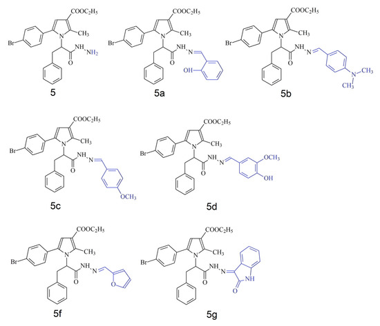 Chemical structures of 5, 5a–5g series of N-pyrrolyl hydrazide-hydrazones. Variable part of molecule presented in blue.