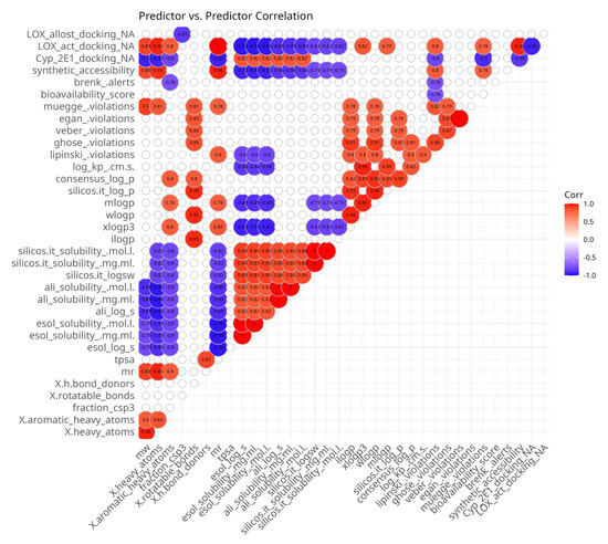 In order to demonstrate the relationships between predictor variables, measured for the compounds of the series 5, 5a–5g, a Spearman’s rank pairwise correlation map was generated. It was filtered to show only statistically significant moderate-to-strong correlations (Figure 2). The presence of multiple correlated predictor variables might hinder the interpretation of results, but randomly eliminating variables might lead to missing important causal relationships. The correlation map (Figure 2) shows that as expected, there are numerous associations among predictor variables. The most positively intercorrelated parameters are those related to water solubility. They are the outputs of three SwissADME [56] models, ESOL, Ali and SILICOS-IT, each of which is represented by three values: LogS, mg/mL and mol/L. ESOL and Ali methods rely on molecular descriptors and lipophilicity, while SILICOS-IT uses a fragmental approach corrected by molecular weight. All water solubility-related parameters are inversely correlated with some molecular mass-related parameters. ESOL and SILICOS-IT are also negatively associated with lipophilicity and synthetic accessibility.