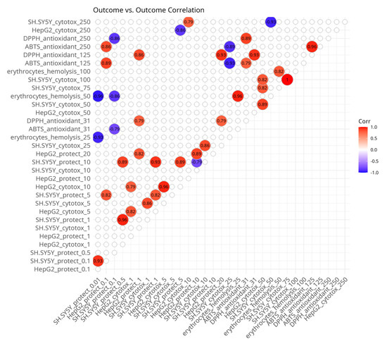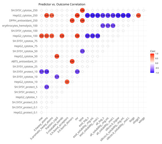 The monotonic associations among potentially predictive in silico variables and in vitro outcomes, as well as between predictors and outcomes, were assessed by calculating Spearman’s rank correlation coefficients with the Hmisc (version 5.2-3) [63] R package. This exploratory approach was chosen due to the small observation size of the dataset because it is more robust to the impact of eventual outliers. This approach provides insight about the presence of highly correlated groups of variables. It is based on rank statistics and calculates pairwise correlation coefficients (ρ) and associated p-values. Cutoff thresholds for correlation (|ρ| > 0.6) and statistical significance (p < 0.05) were applied to isolate moderate-to-strong associations and control for type I errors. For symmetric correlation matrices (i.e., predictor–predictor and outcome–outcome comparisons), only variables demonstrating at least one significant correlation (beyond the predefined thresholds) with other variables were retained for visualization. For non-symmetric matrices (i.e., predictor–outcome comparisons), filtering was applied across rows and columns separately to ensure that each retained variable had at least one significant association in the corresponding dimension. Correlation plots were generated using the ggcorrplot (version 0.1.4.1) [64] R package.