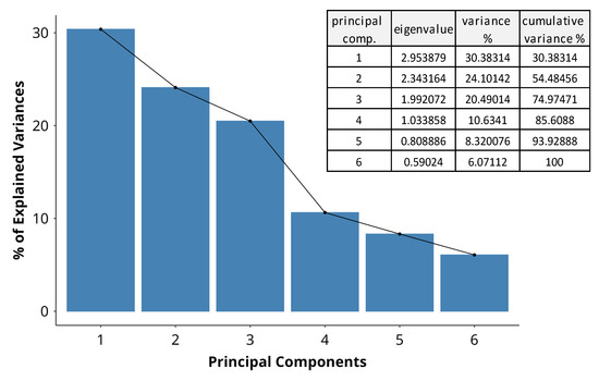 Differences within the data were aggregated and represented as principal component (PC) variables by MFA. The scree plot (Figure 5) summarizes the variance in the dataset explained by each PC. PC 1 and PC 2 are the most significant, explaining more than half of the total variance, at 30% and 24%, respectively. PC 3 and PC 4 have eigenvalues over 1 and explain a further 20% and 11%, bringing the cumulative variance across the first four components to 85%. The sharp decline in explained variance at PC 4 suggests that the majority of the variability in the data can be captured with the first three dimensions. PC 5 and PC 6 explain only 8% and 6%, contributing only marginally to the total variance. They are unlikely to substantially contribute to the interpretation of major trends in the dataset. By applying the Kaiser criterion for further analysis, we disregard PCs 5 and 6, which have eigenvalues lower than 1 (Figure 5).