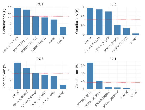 In PC 3, radical scavenging is the dominant contributor (>25%), followed by cytotoxicity in HepG2 and borderline cytotoxicity in SH-SY5Y (18–23%). Changes in the coordinates in PC 3 can be interpreted as primarily related to direct radical scavenging activity. PC 4 is strongly dominated by cytotoxicity in HepG2, which accounts for over 60% of the variance, followed by cytotoxicity in SH-SY5Y with over 20%. It might be interpreted as being influenced by factors driving cell death predominantly in HepG2 cells and, to much lower extent, in SH-SY5Y cells.
